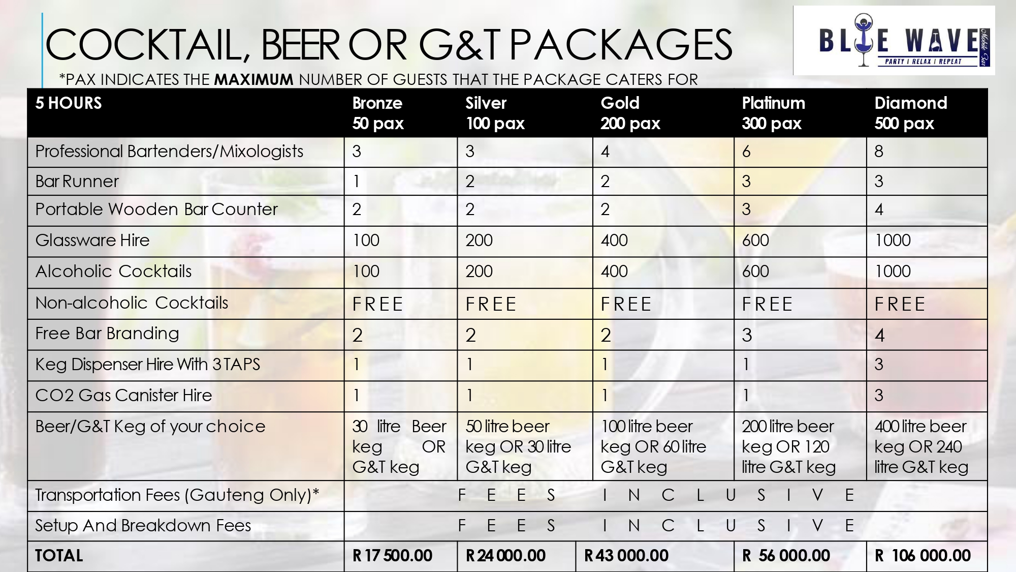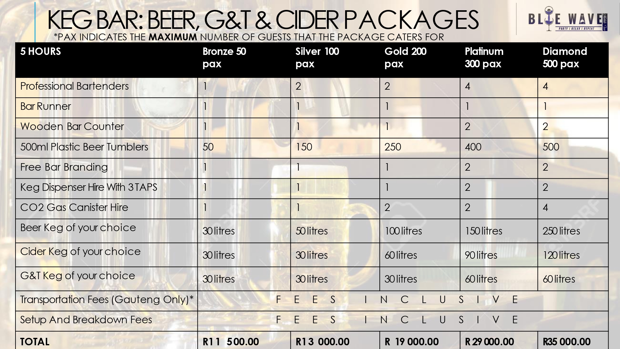 Services What We Do Cocktail Packages These packages include staff and equipment hire, cocktailsand mocktails. Download Cocktail & Beer or G&T Keg Packages These packages include staff and equipment hire, cocktails and mocktails, and the choice of an additional beer OR G&T keg hire. Download Full House Package These packages include staff and equipment hire, cocktails and mocktails, beer, cider, AND G&T keg hire. Download Premium Packages These packages include staff hire, premium equipment hire, cocktails and mocktails, beer, cider and G&T keg hire. Download Beer, Cider and G&TPackages These packages include staff hire, equipment hire, and beer, cider and G&T keg hire. Download Dry Bar Hire Pricing guide for glassware, bar equipment and staff hire. Download