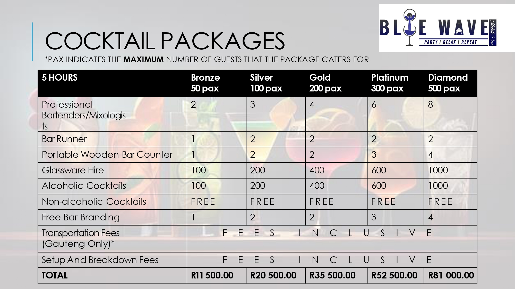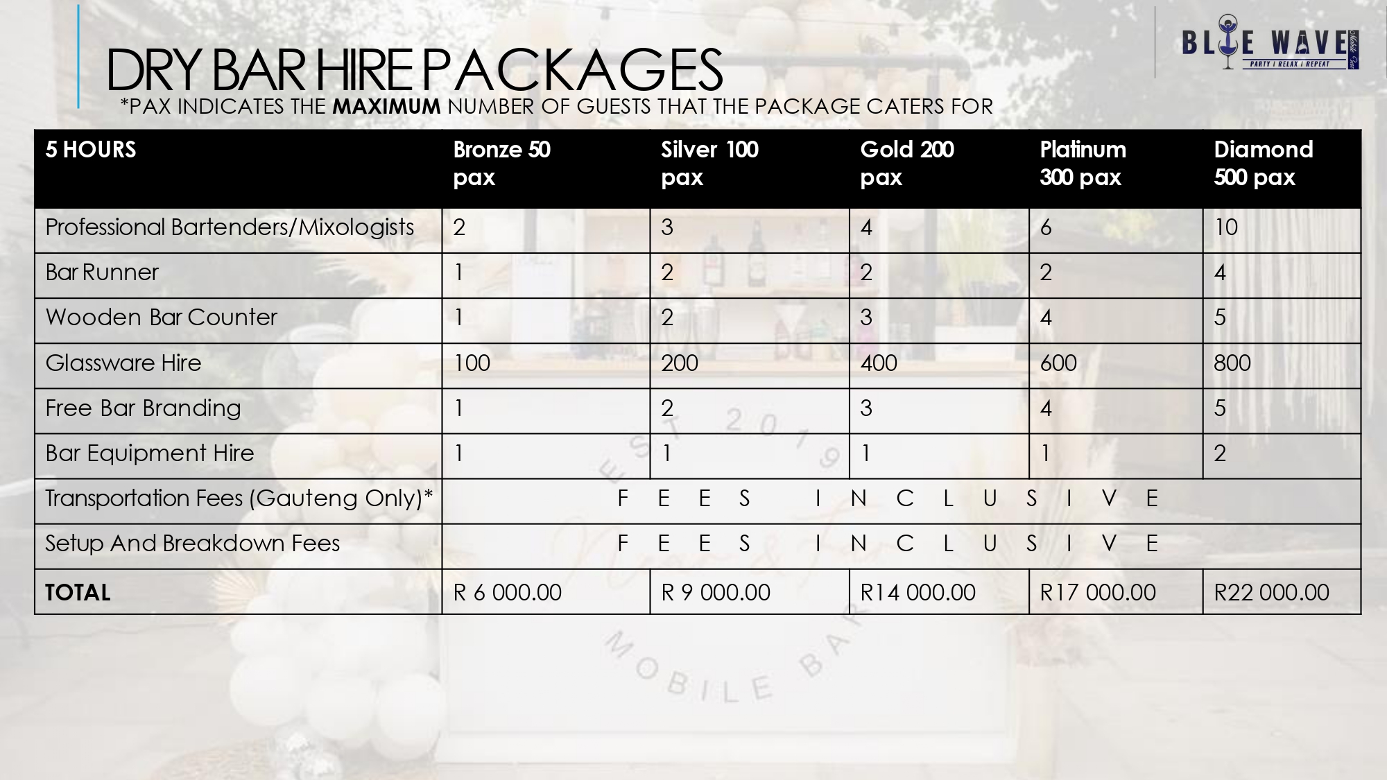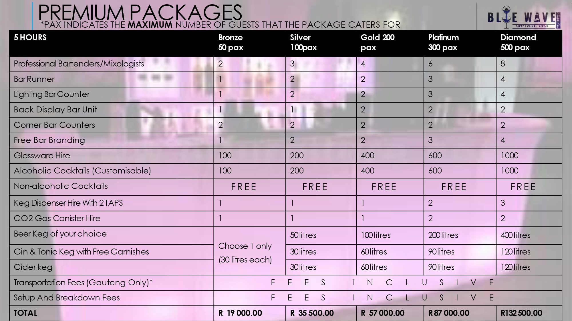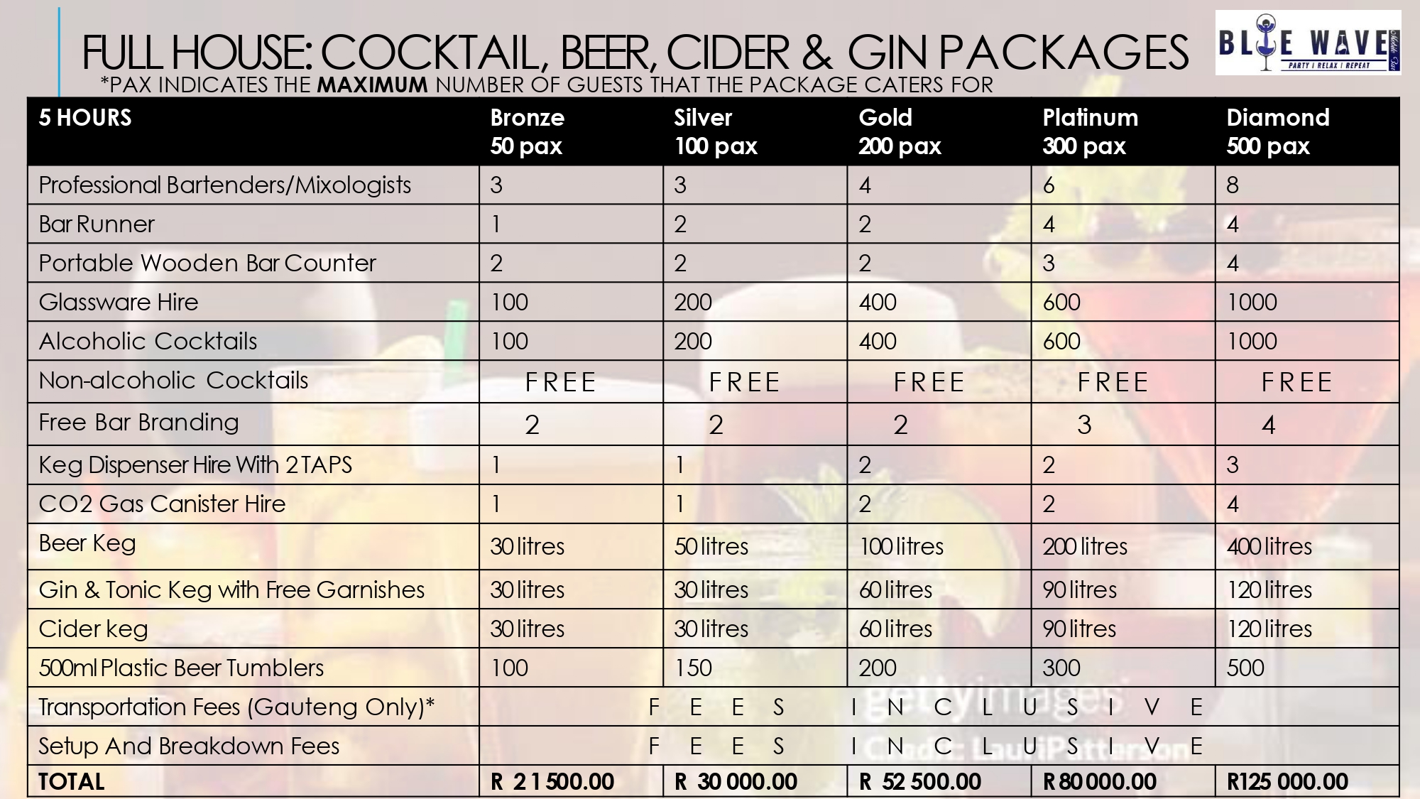 Services What We Do Cocktail Packages These packages include staff and equipment hire, cocktailsand mocktails. Download Cocktail & Beer or G&T Keg Packages These packages include staff and equipment hire, cocktails and mocktails, and the choice of an additional beer OR G&T keg hire. Download Full House Package These packages include staff and equipment hire, cocktails and mocktails, beer, cider, AND G&T keg hire. Download Premium Packages These packages include staff hire, premium equipment hire, cocktails and mocktails, beer, cider and G&T keg hire. Download Beer, Cider and G&TPackages These packages include staff hire, equipment hire, and beer, cider and G&T keg hire. Download Dry Bar Hire Pricing guide for glassware, bar equipment and staff hire. Download